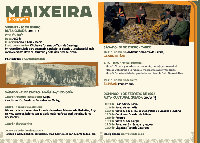 El programa incluye rutas culturales guiadas, un mercado vivo del maíz con representación de oficios tradicionales en directo, showcooking con la participación de Jhonatan González Ovalle de la pastelería Cabo Busto y Miguel Sierra, maestro pastelero y presidente de la Asociación para la Recuperación de la Memoria del Maíz Asturiano (Tarucu), actividades infantiles, comida popular, conciertos y mesas de diálogo abiertas al público. Es en estas mesas donde se aborde el papel del maíz en la vida rural y en el patrimonio, su presencia en la cocina y su potencial como base para experiencias turísticas auténticas y sostenibles dentro de una propuesta más amplia de valorización territorial.